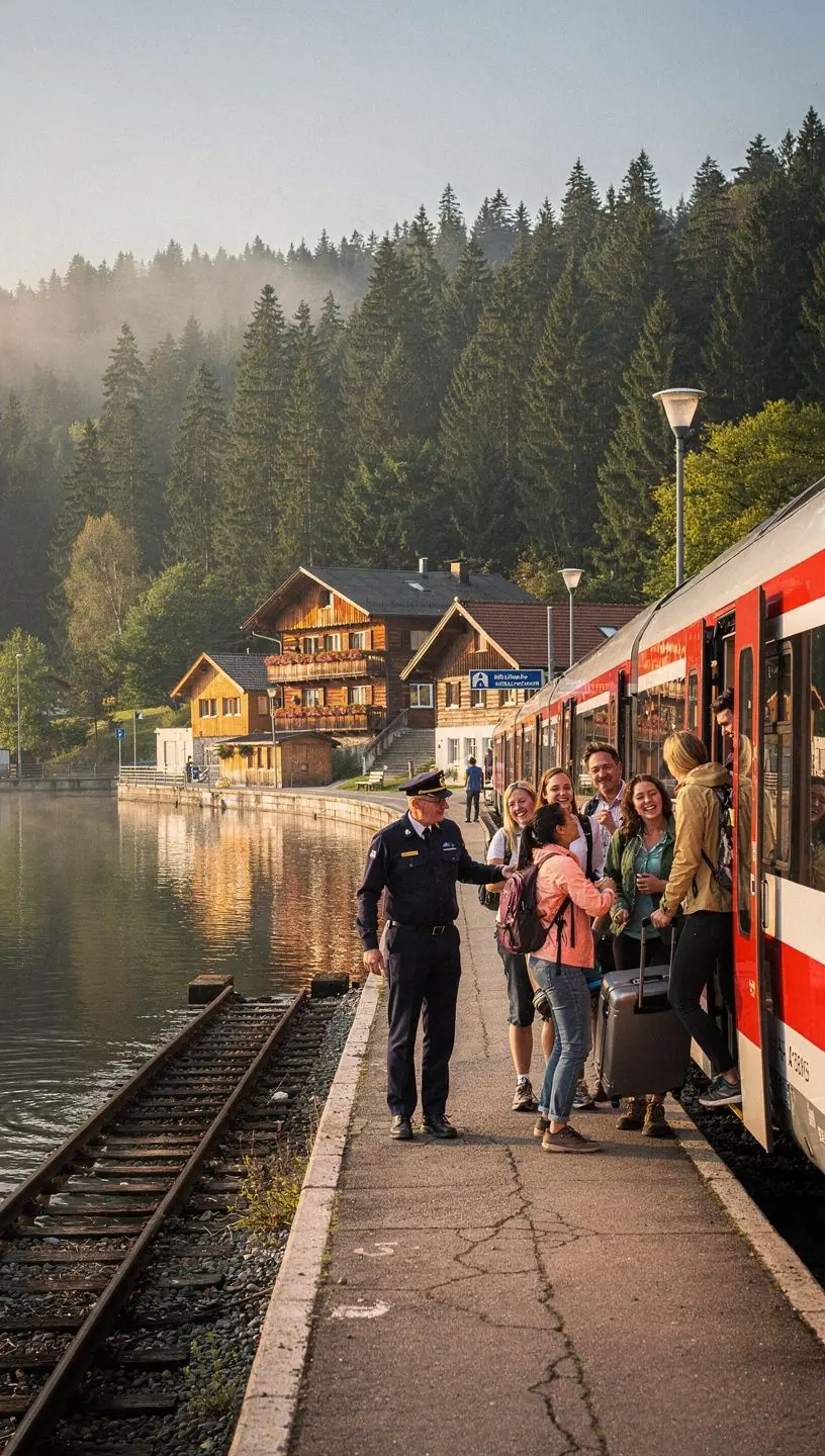 Fahrgäste steigen entspannt in einen komfortablen Regionalzug ein, der für eine landschaftlich reizvolle Route vorbereitet ist.